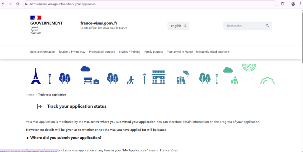 - https://france-visas.gouv.fr/en/track-your-application Check the “My Applications” area on the official.